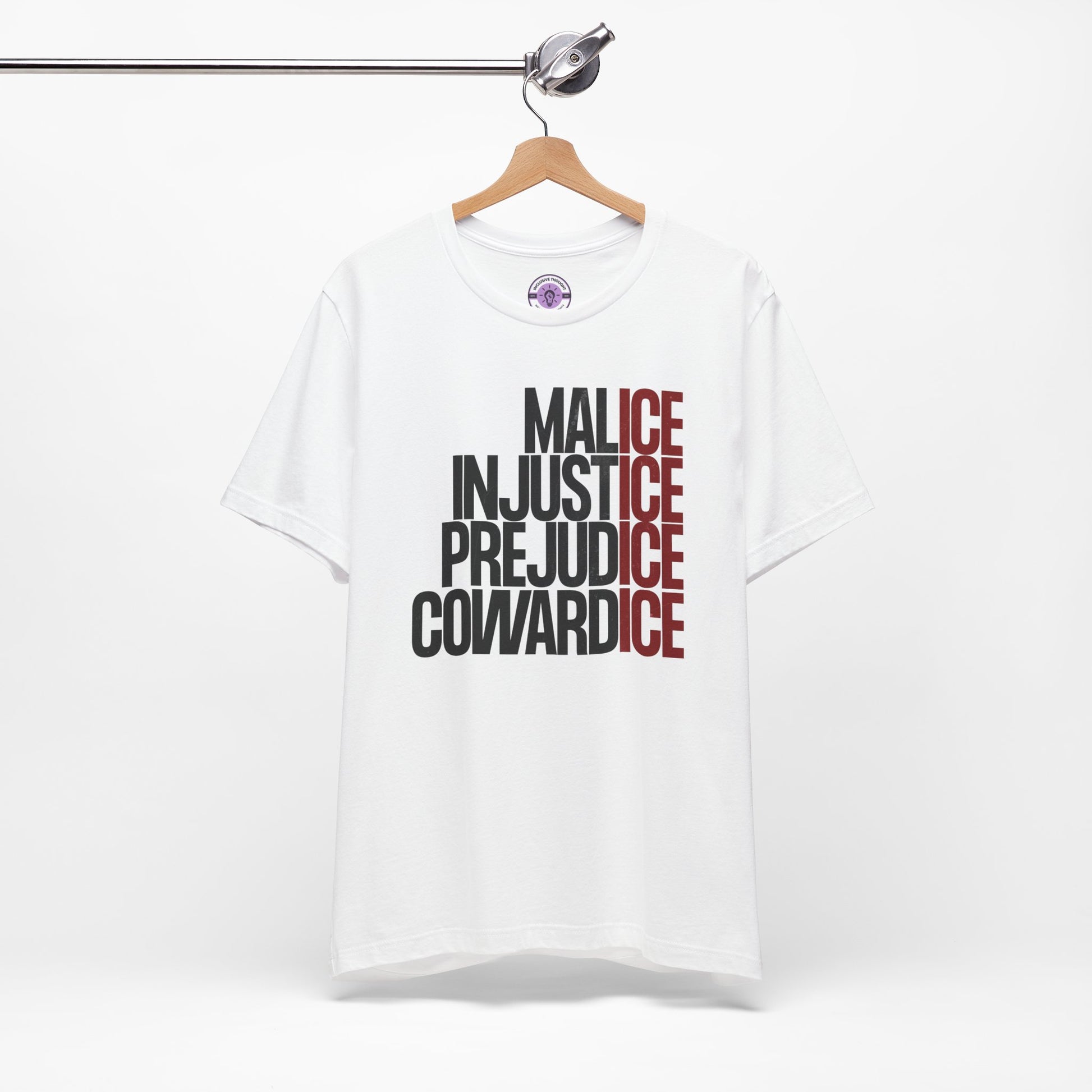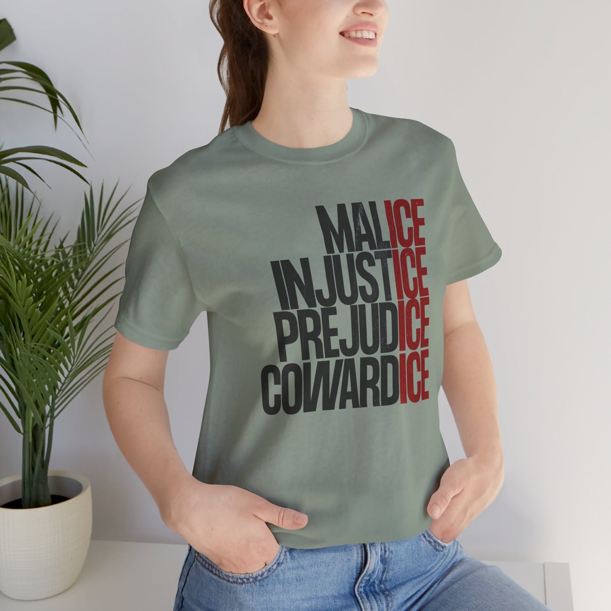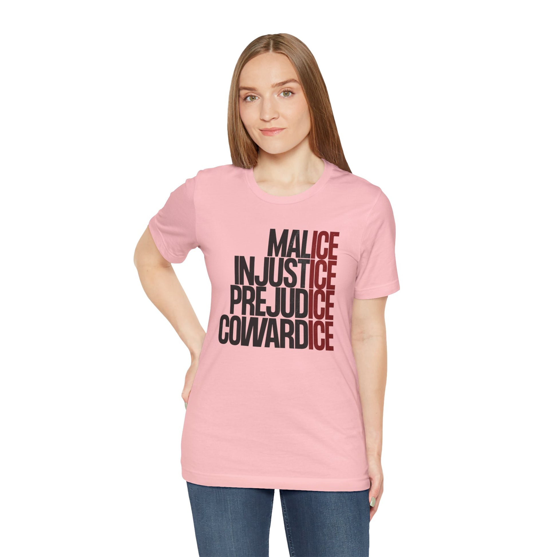 This anti-ICE, pro-immigration t-shirt doesn’t hedge its language. It’s a direct statement against cruelty, injustice, and state-sanctioned harm. Featuring a stacked typographic design that calls out malice, injustice, prejudice, and cowardice, this piece rejects silence and stands firmly with immigrant communities.