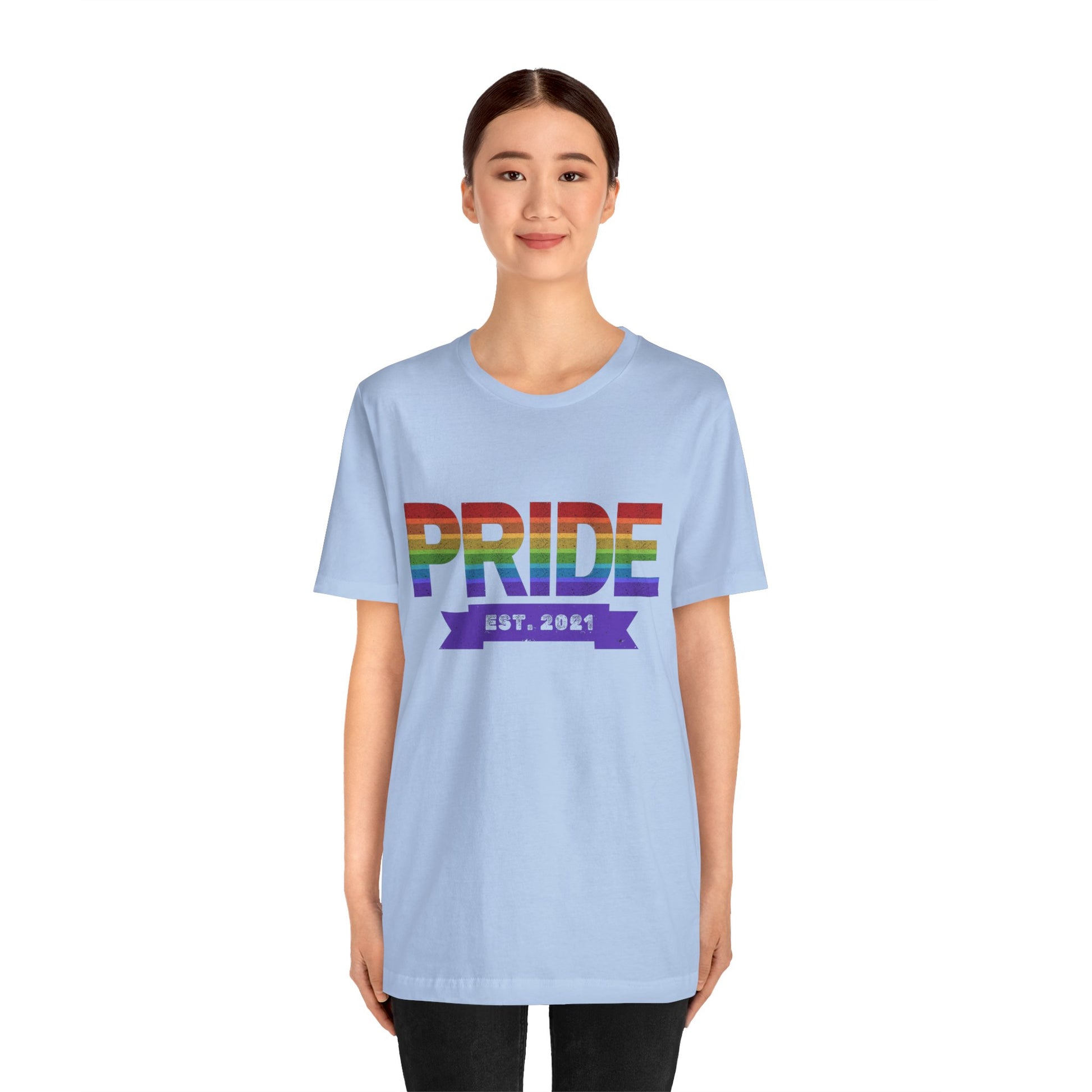 Bold rainbow block lettering says “PRIDE,” with your custom date printed below in a clean banner. Choose from three formats (year, full date, or month + year) to tell your story your way.