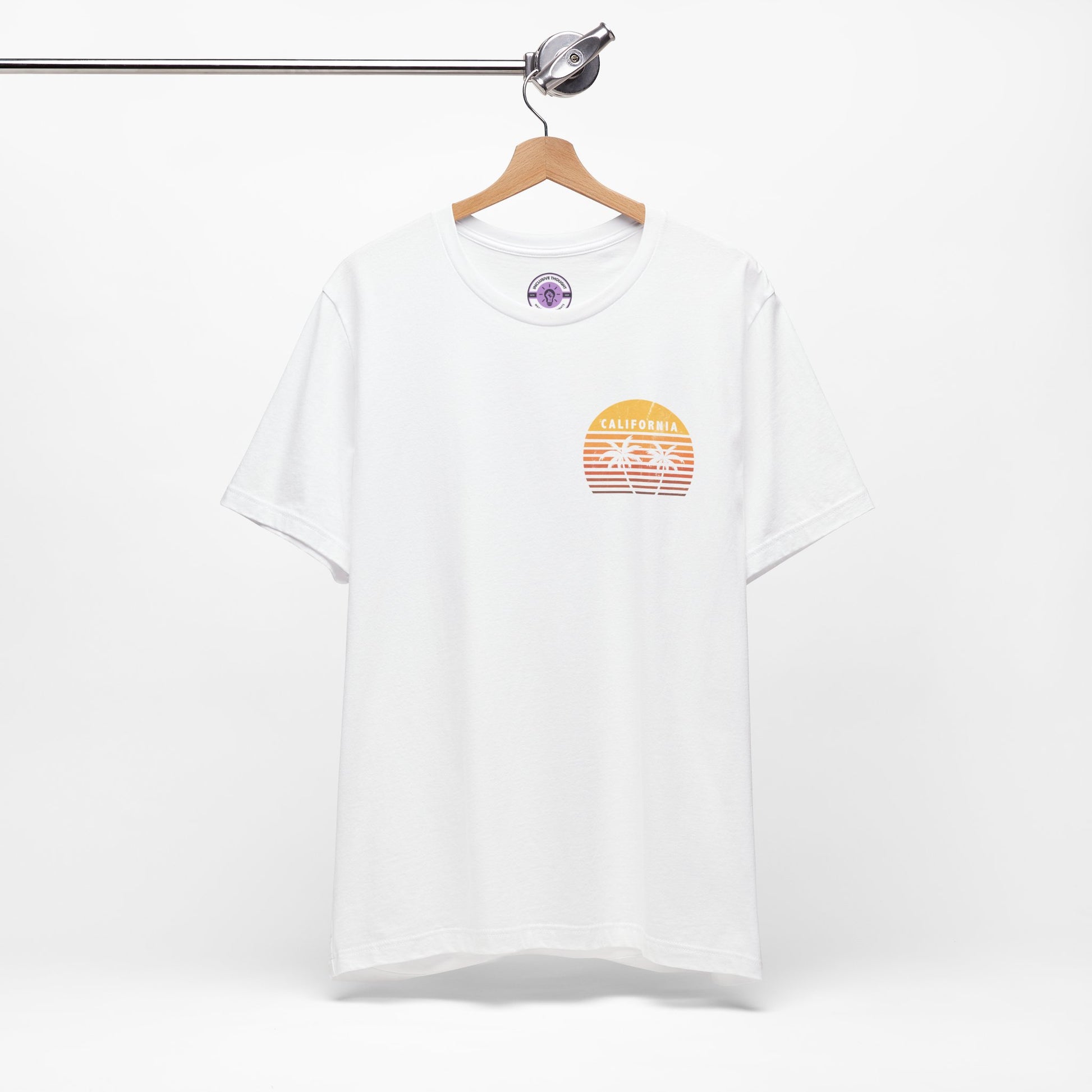- Front chest print: retro sunset with palm tree logo