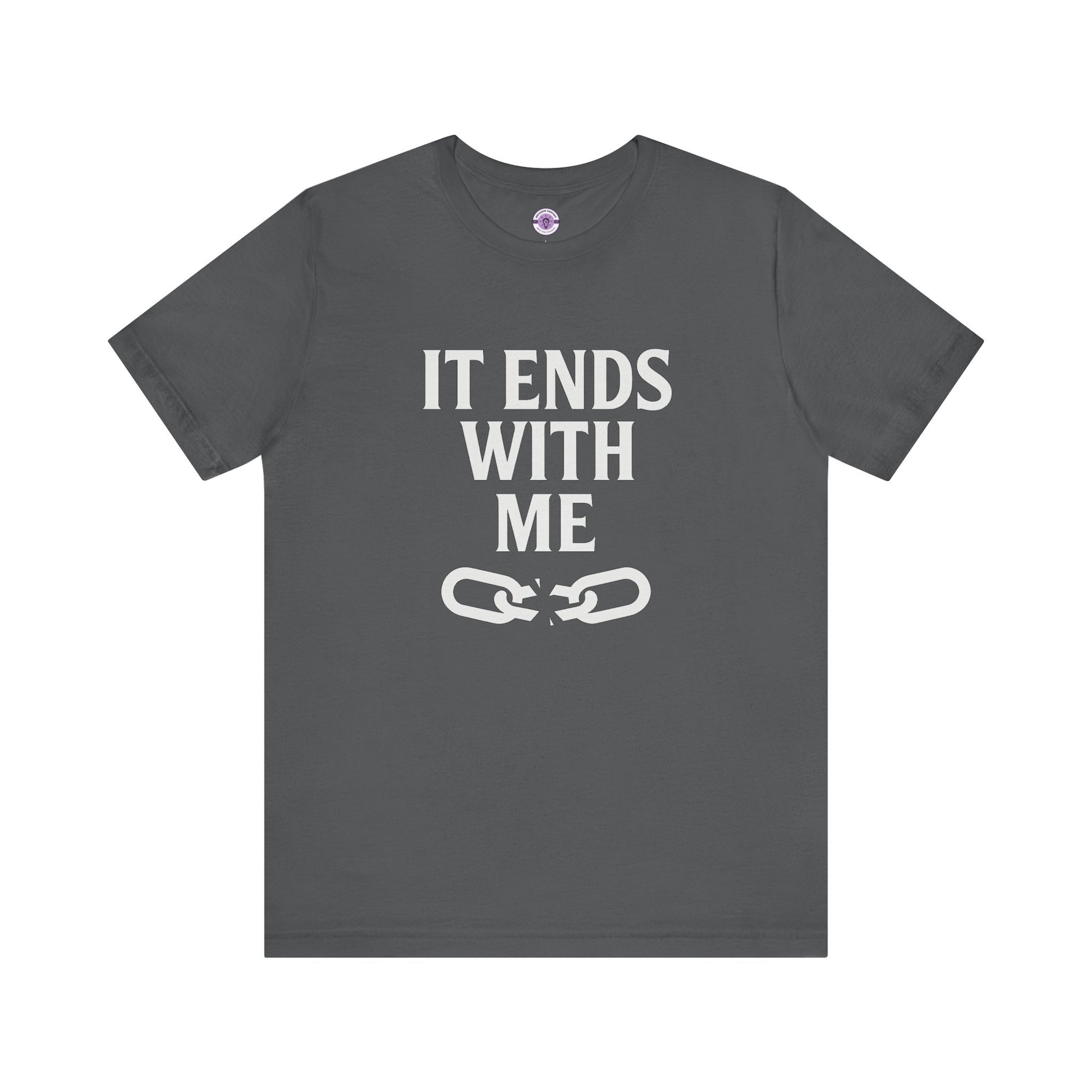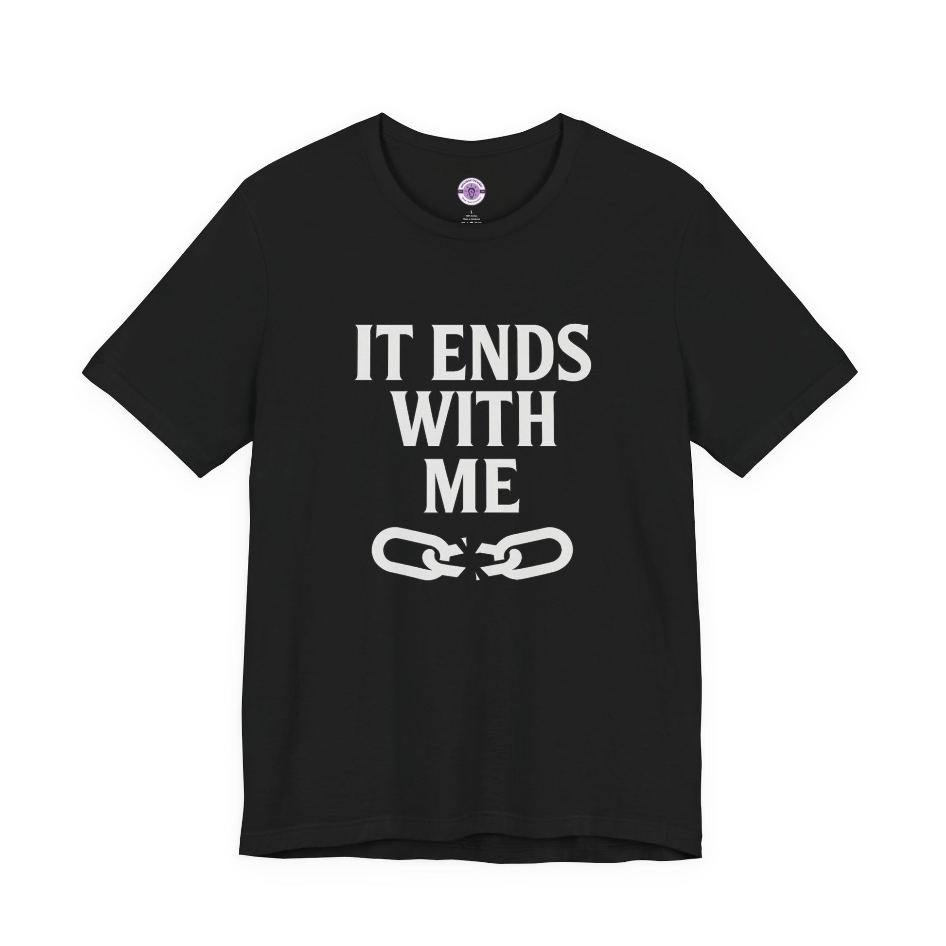 A bold T-Shirt with the text 'It Ends With Me' and a broken chain graphic beneath it for mental health awareness. This T-Shirt is ideal for those looking to make a statement and raise awareness about mental health. Perfect for casual wear and for individuals passionate about mental health advocacy. Relevant for Mental Health Awareness Month, World Mental Health Day, and everyday wear.