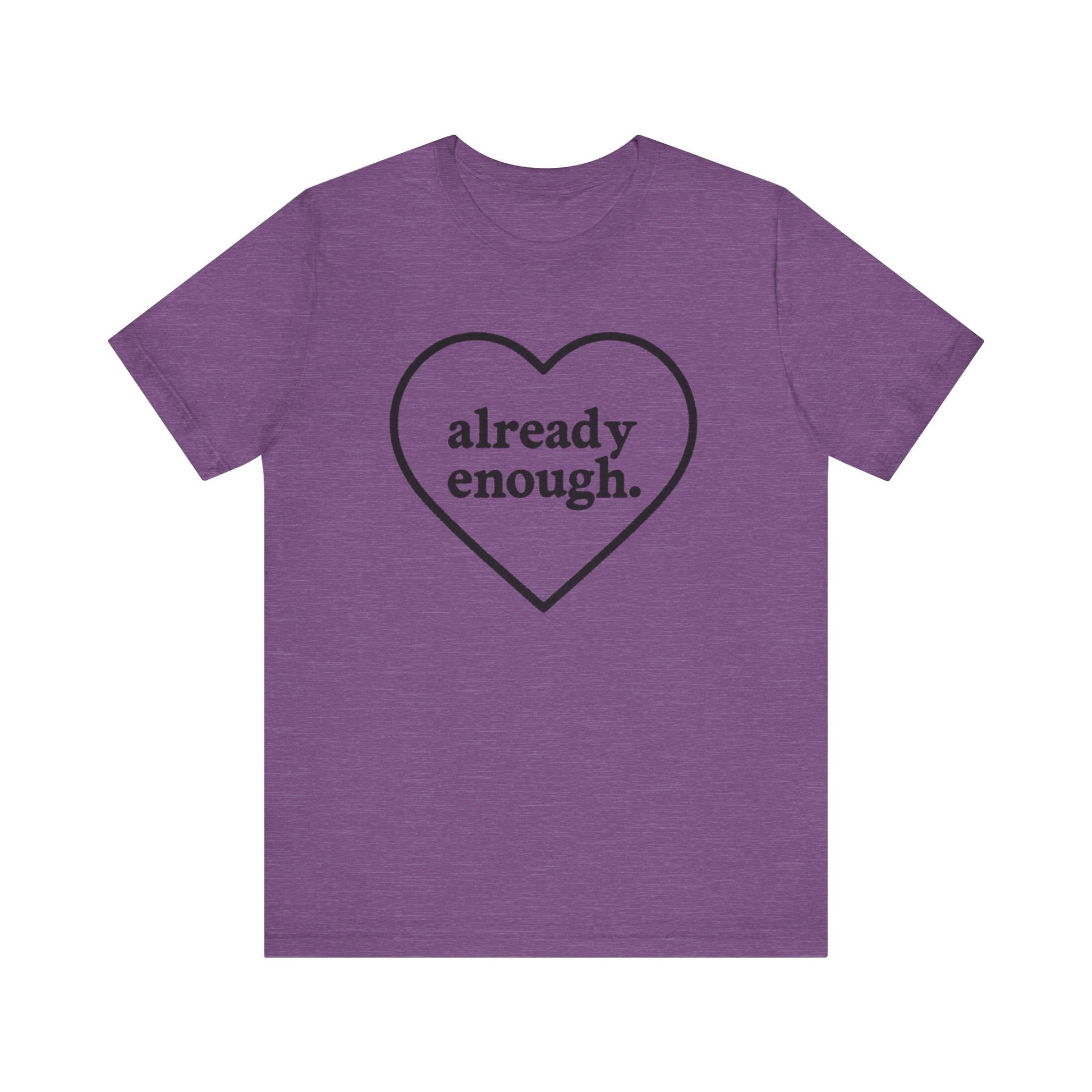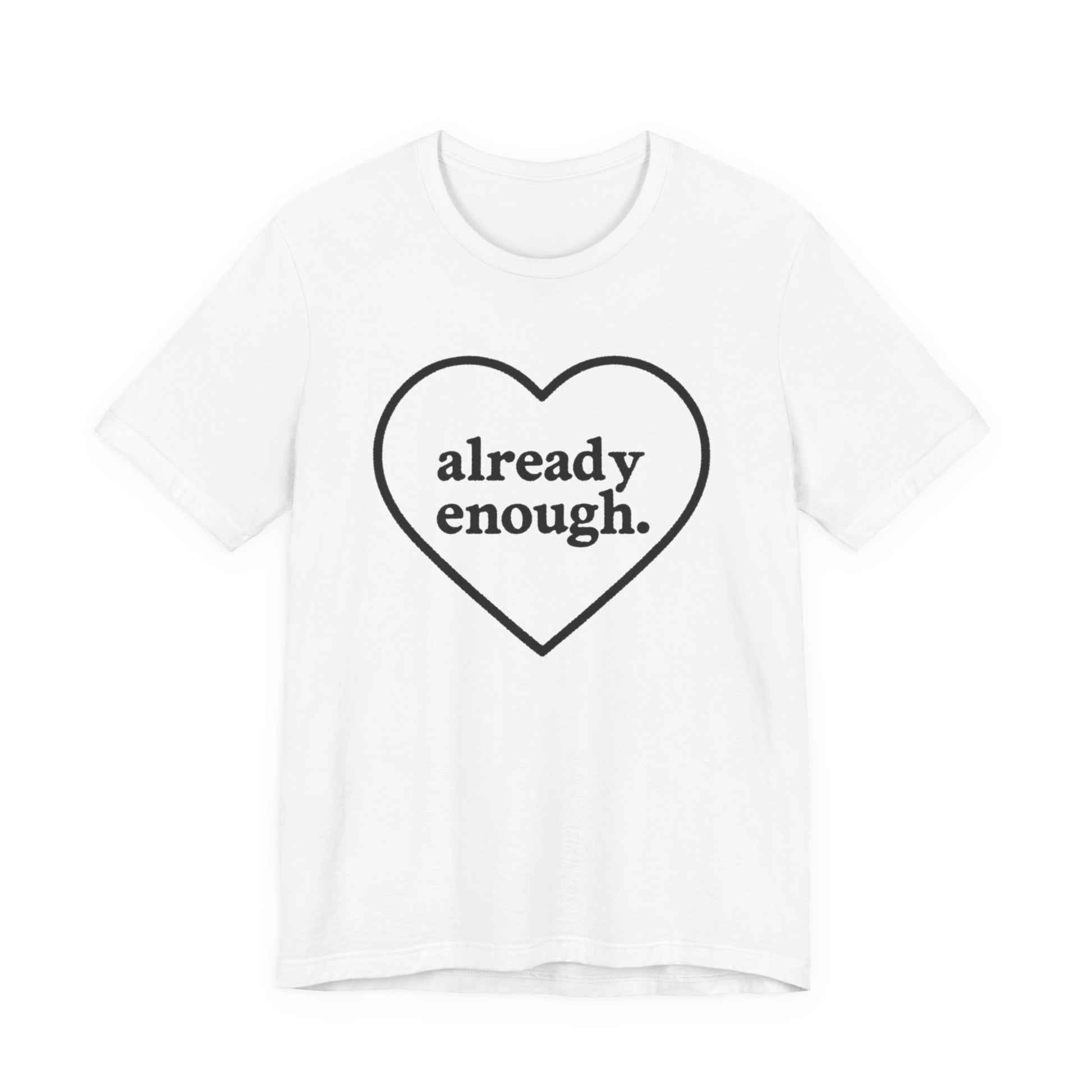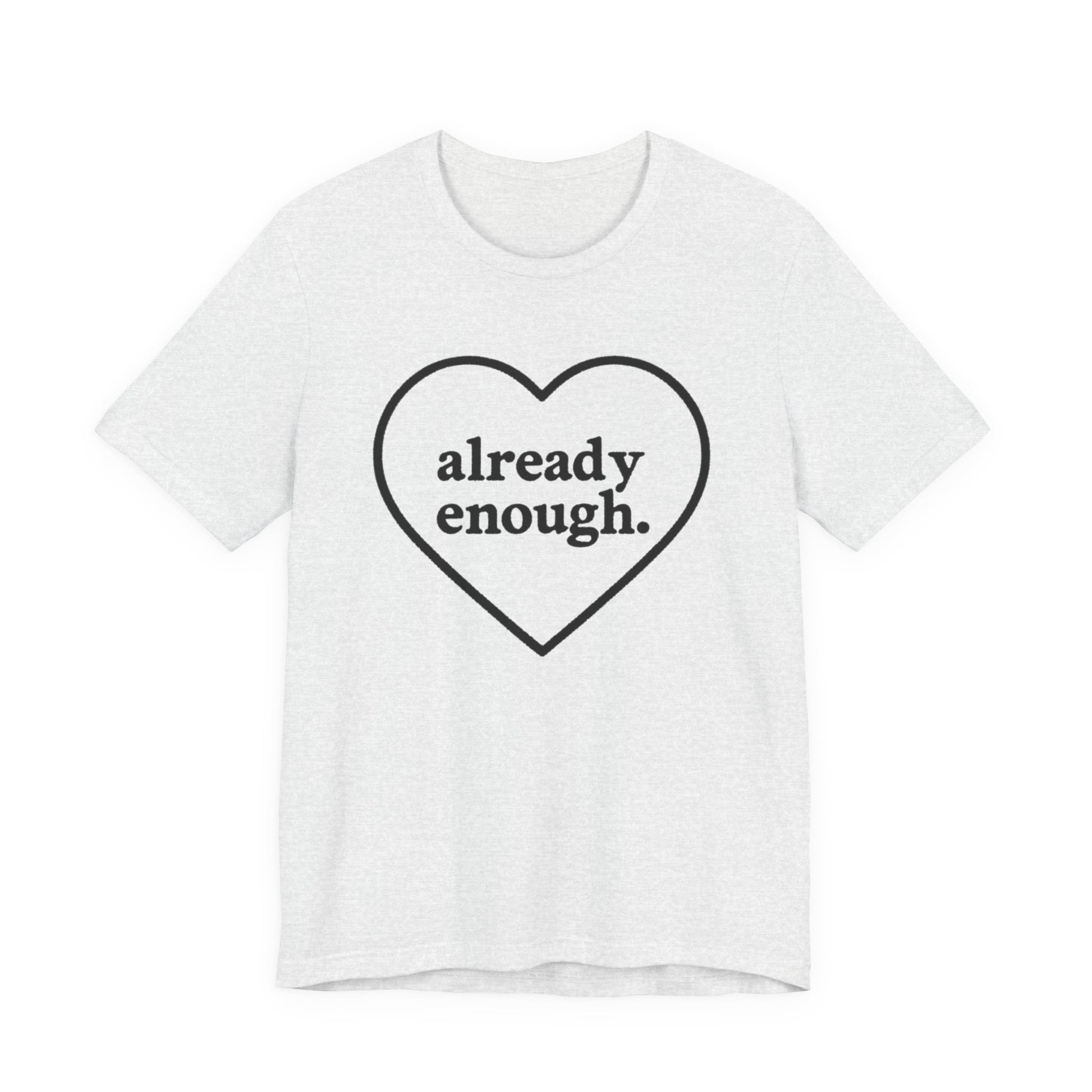 Introducing a stylish Unisex Jersey Short Sleeve Tee, perfect for those who embrace positivity and self-love. The heartwarming message, 'already enough,' radiates encouragement and becomes an instant conversation starter. Ideal for casual outings, lounging at home, or layering for a chic look, this tee is a versatile addition to any wardrobe. Its lightweight and breathable fabric ensures comfort all day long, making it great for warm summer days or cozy nights. The perfect gift for friends, family, or anyone who could use a little affirmation. Celebrate occasions like birthdays, self-care days, or just because – this tee is designed for everyone who believes in spreading love and positivity!